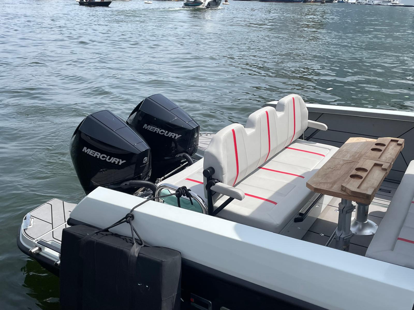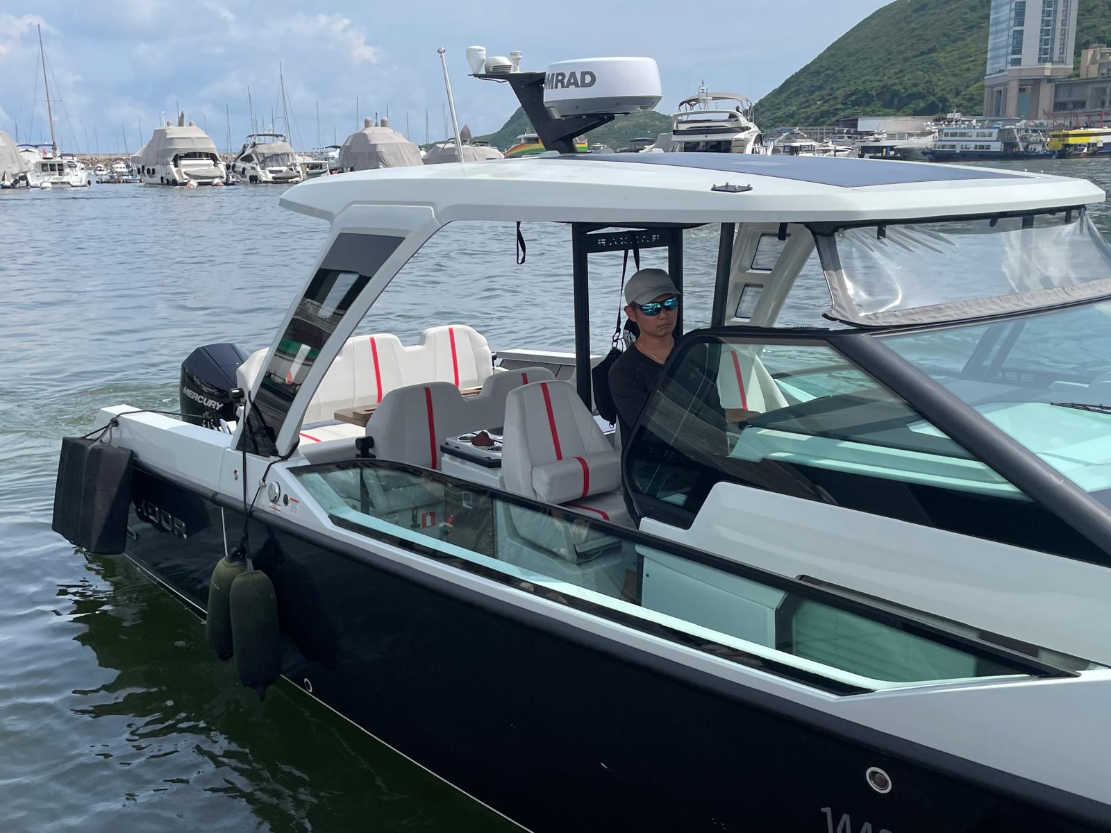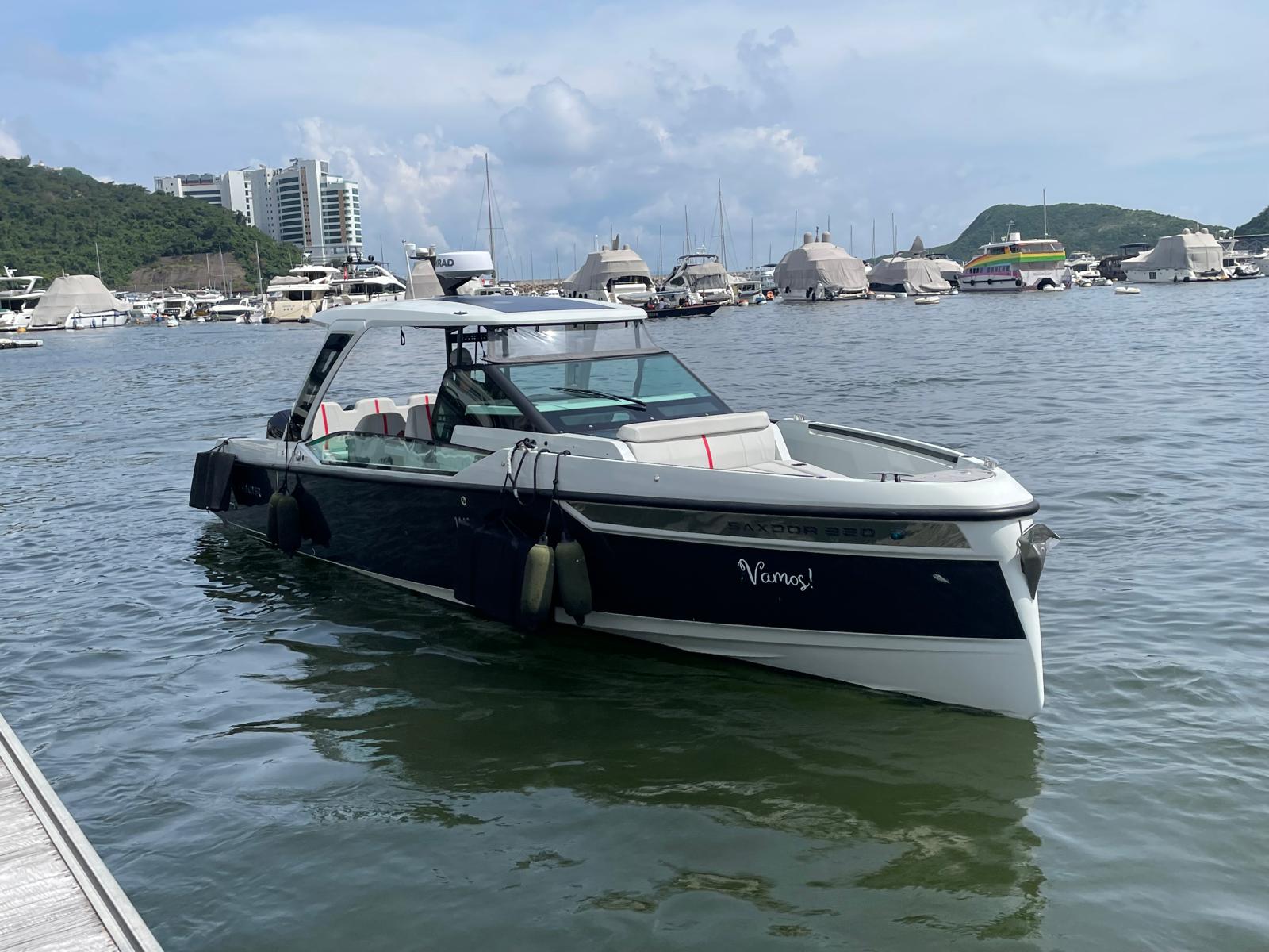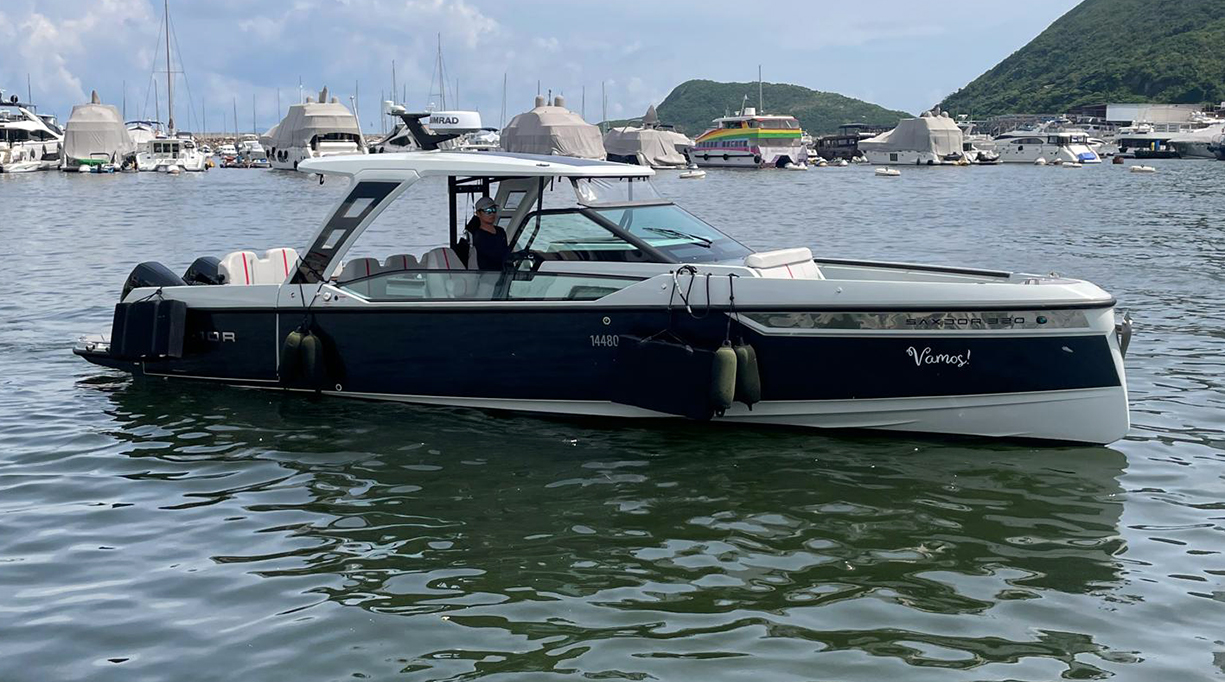 Everyting is in the name: VAMOS, Spanish for “let’s go!” This bestselling model from the famed Saxdor brand boasts two 300 HP Mercury outboard engines and speeds up to 50 knots. Cruising speed varies between 20 and 40 knots, depending on sea state. You can be in Tai Long Wan in less than an hour! Unless you want to hop around the south side, between the seafood restaurants and the best swimming spots, at a specially reduced rate. The socializing space is divided between: a full cabin for napping or spending the night, a well-equipped galley kitchen in the cockpit, a sitting area aft and a sundeck forward.