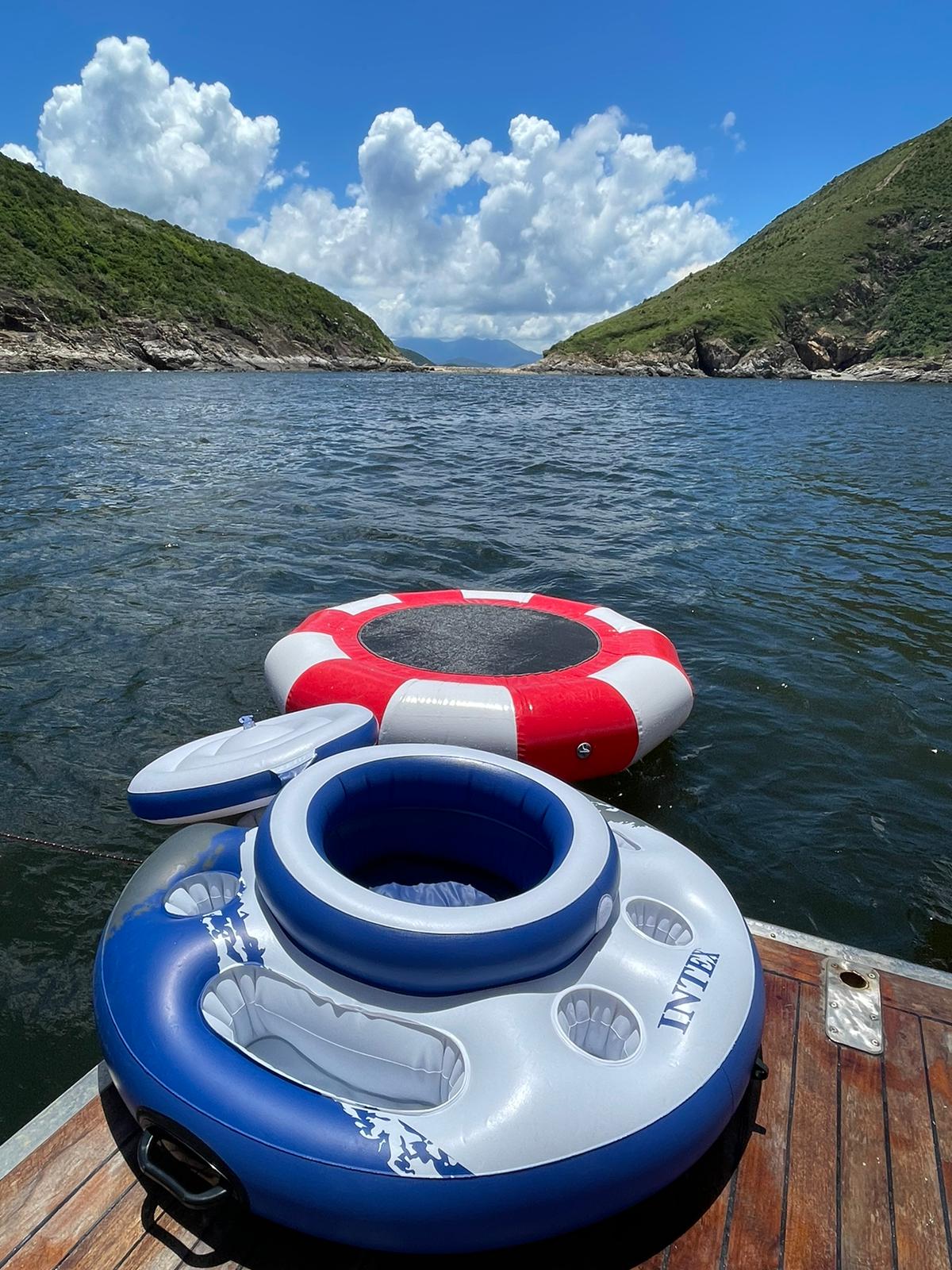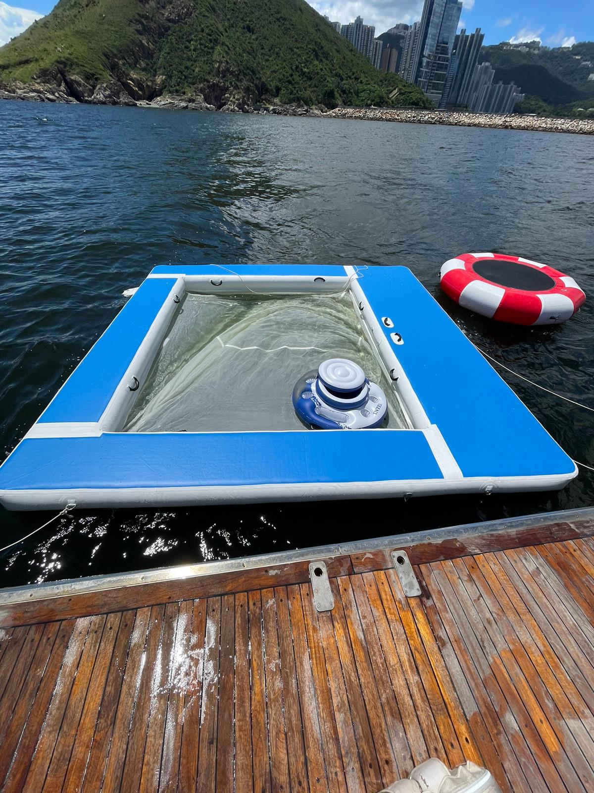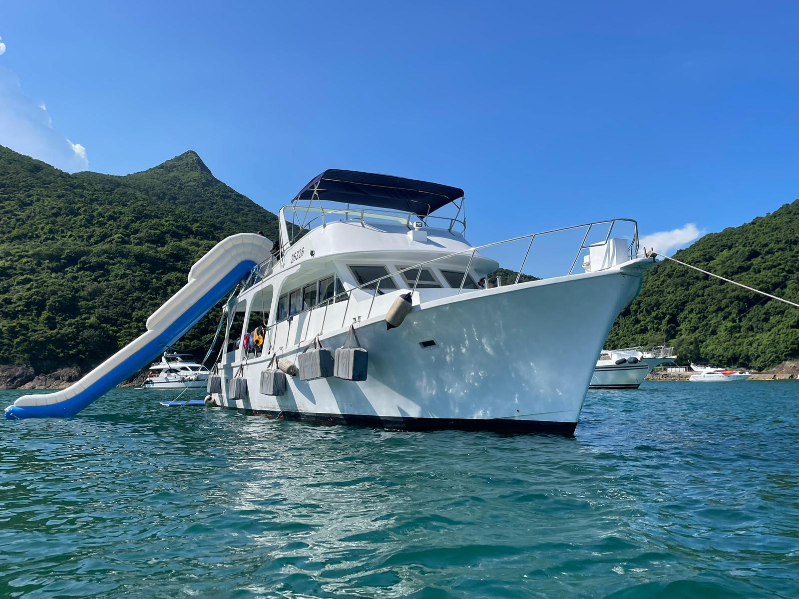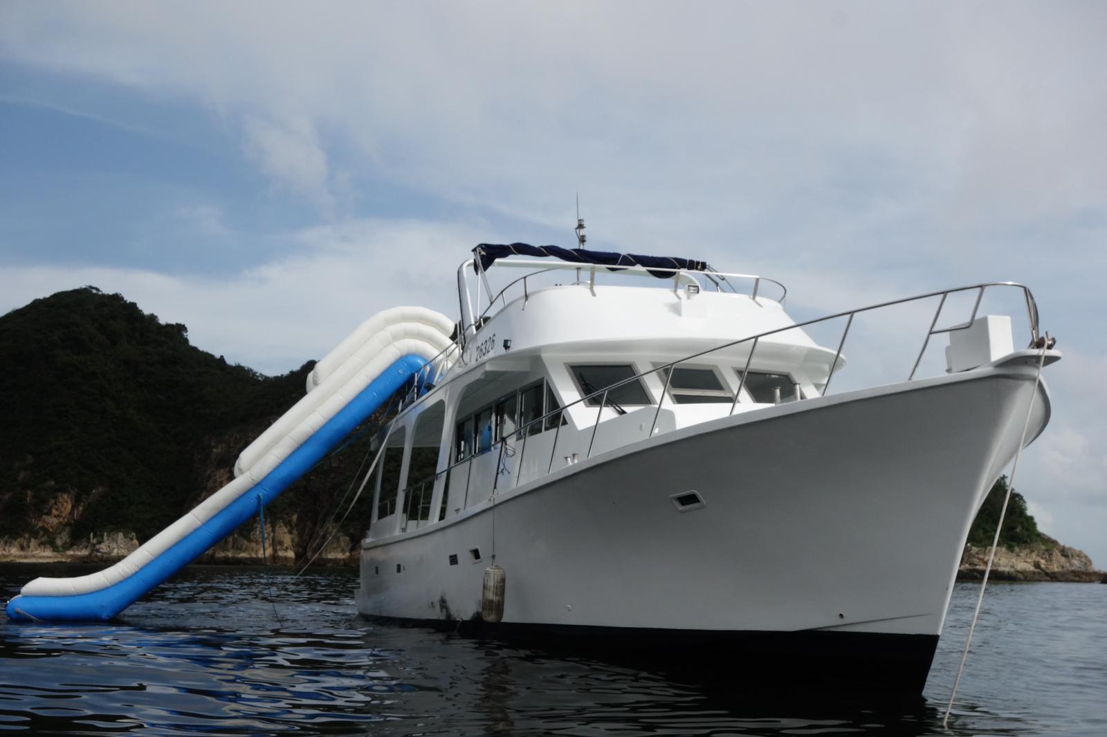 Price: Mon – Fri: 25 guests or less HK$7,700.00, extra guest +HK$330.00/person. Saturday & Sunday: 25 guests or less HK$9,600, additional guest +HK$330.00/person. Earliest boarding time, Aberdeen, Central Piers or Causeway Bay: 9 am. Latest return 11 pm. Prices include crew, fuel, ice, refrigerator and use of induction cooking rings and oven. Saikung $2,000 extra fuel charge. Floating mats are provided for free. Toys are charged an extra: kayak HKD 500, water pool HKD 2,000, slider HKD 2,500 or all the above HKD 3,000