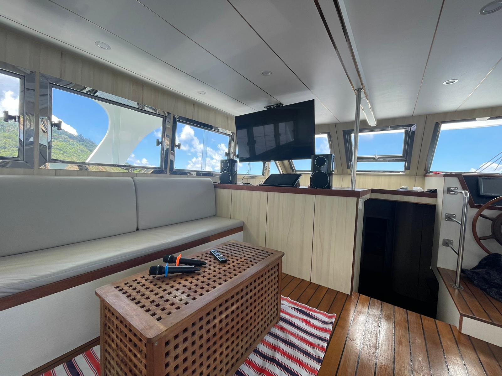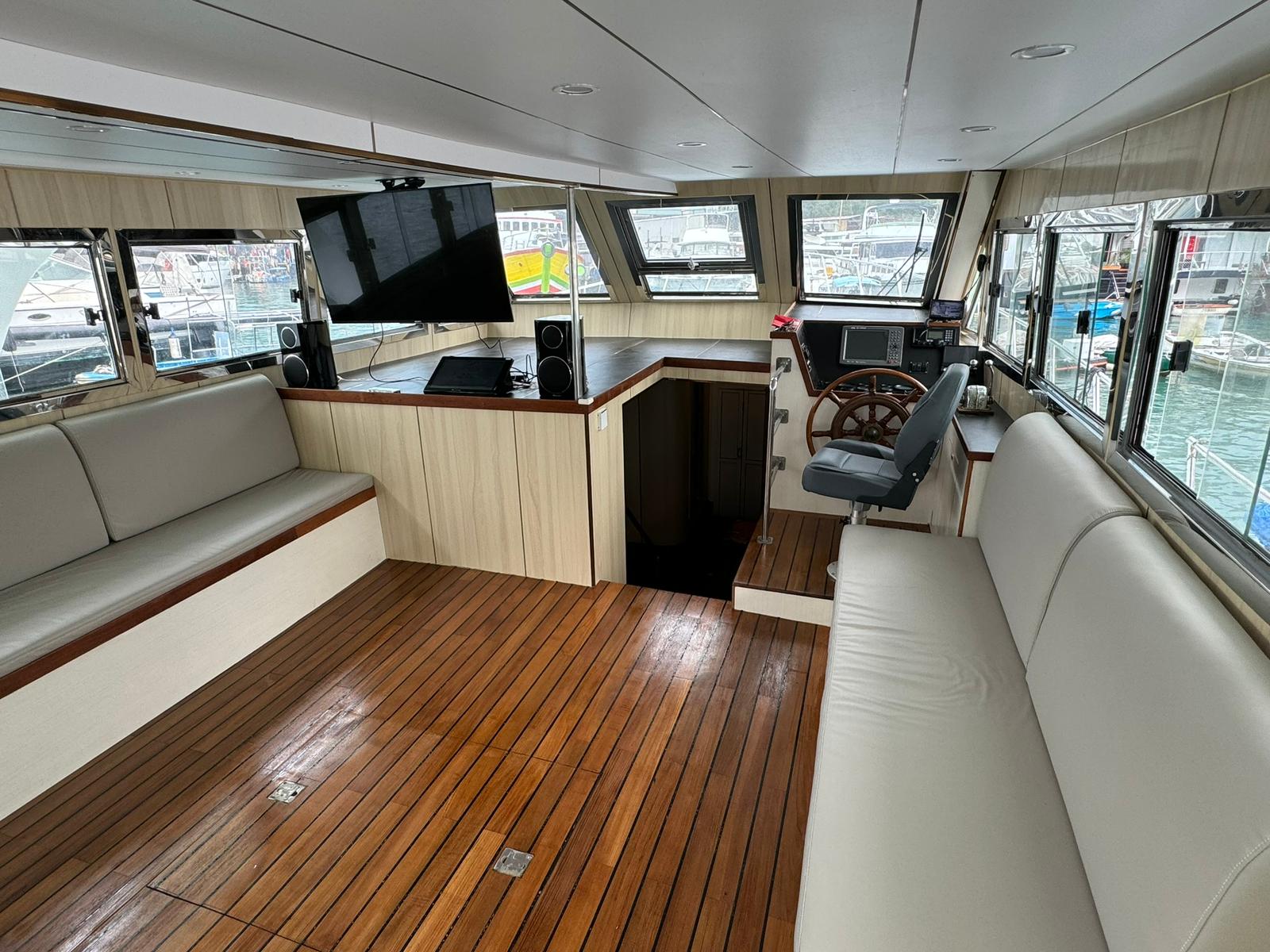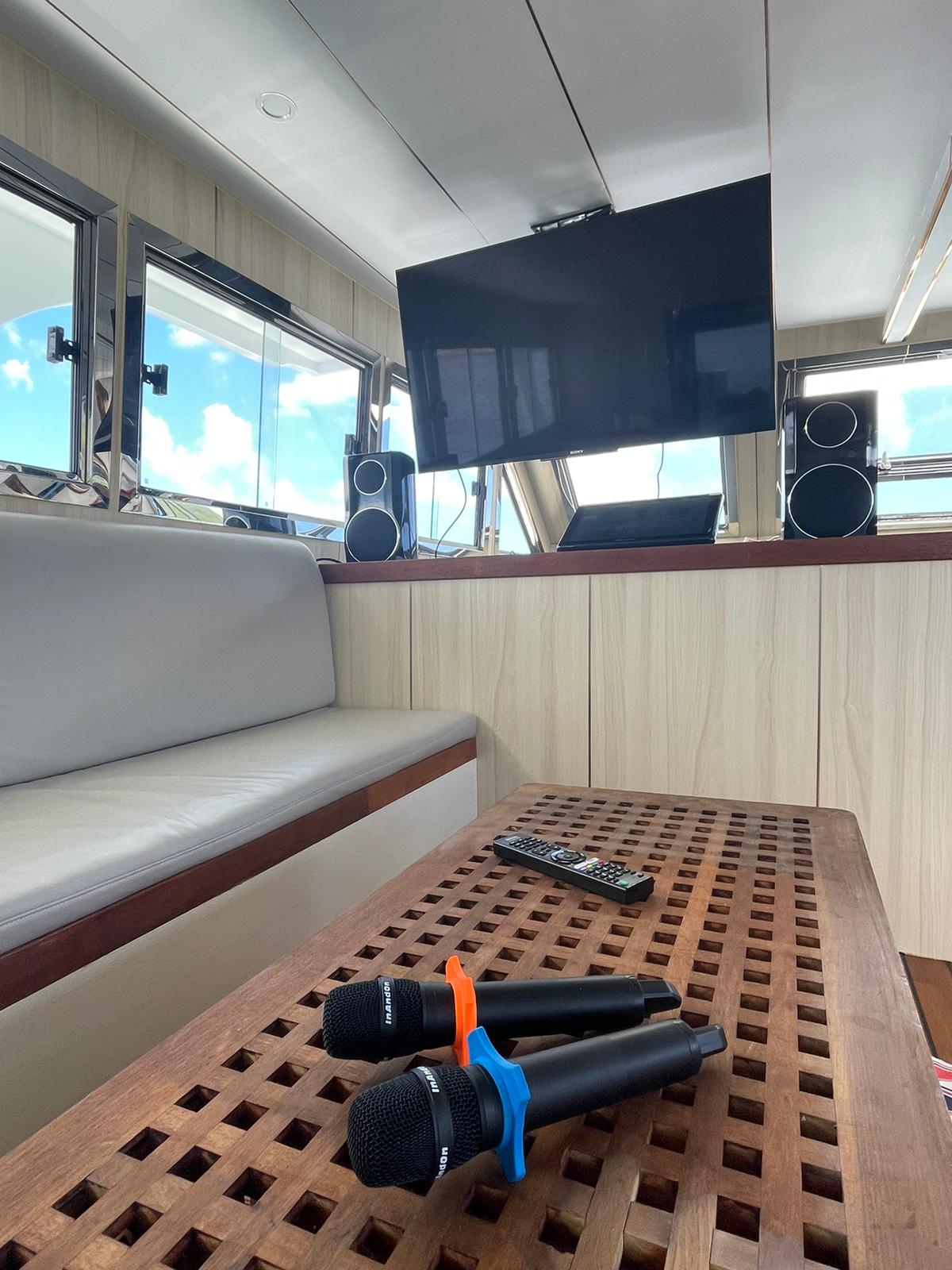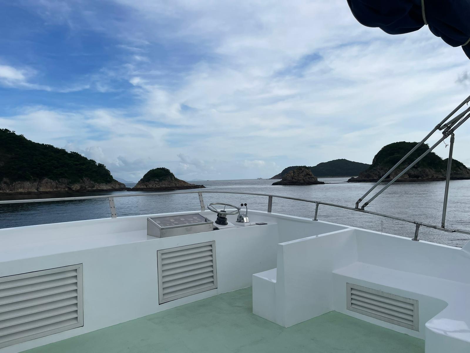 Price: Mon – Fri: 25 guests or less HK$7,700.00, extra guest +HK$330.00/person. Saturday & Sunday: 25 guests or less HK$9,600, additional guest +HK$330.00/person. Earliest boarding time, Aberdeen, Central Piers or Causeway Bay: 9 am. Latest return 11 pm. Prices include crew, fuel, ice, refrigerator and use of induction cooking rings and oven. Saikung $2,000 extra fuel charge. Floating mats are provided for free. Toys are charged an extra: kayak HKD 500, water pool HKD 2,000, slider HKD 2,500 or all the above HKD 3,000